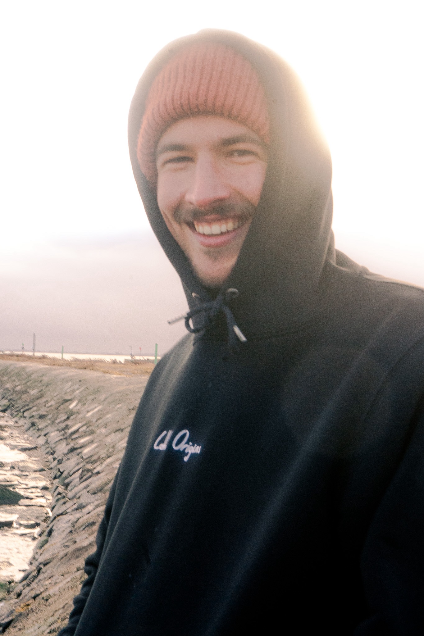 For our first sweater and hoodie line, it was important to us to create something special! We agreed as a team: the front lettering had to be embroidered and not printed! Lukas also came up with something new for the back print: By using a two-sided printing process, we were able to implement a two-color design for the first time in this design.